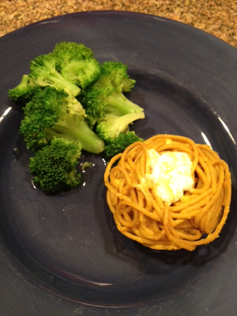 - In the muffin tin, use a fork to twirl the spaghetti into nests.