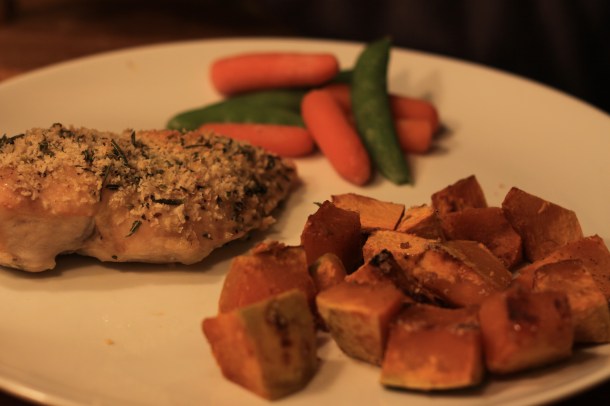 I was in a pickle tonight – this happens to me pretty often. I wasn’t able to make the meal I’d planned because I didn’t allow enough defrost time. It’s usually that or I thought I had an ingredient I needed, but it turned out I didn’t. I threw this together and it was a huge hit with the fam. My oldest was trying to steal chicken off anyone’s plate that wasn’t looking. The little guy was scamming to get more squash. Win