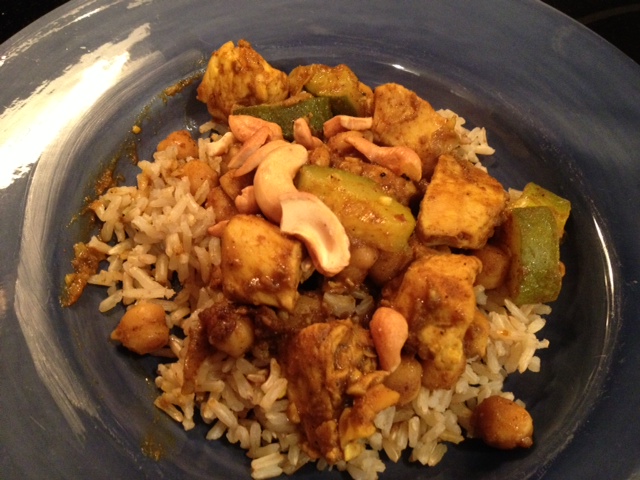 I put dinner on the table and my son said “I don’t like that.” It had smelled so good while it was cooking I was hoping to avoid this conversation. Apparently, that was not to be…. So, my husband and I started with the usual responses like “How do you know if you don’t even try it?” and “That’s what’s for dinner so eat up!” Before we went too far down that road, I stuck a chick pea, a piece of zucchini, and some chicken on his fork and asked (aka told) my 4-year-old to open up. He did, in went his first bite of dinner, and we didn’t hear another peep aside from “It sure is good!” My husband gives this dinner two thumbs up. Both he and my daughter wanted the leftovers for tomorrow’s lunch. Eureka! My foray into cooking with curry was successful!