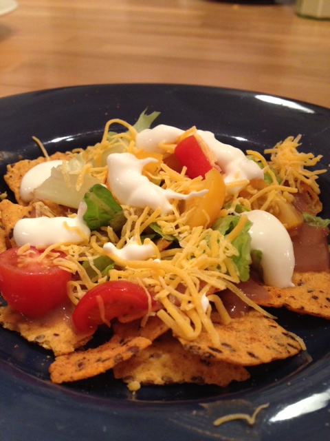 Last Thursday, I had another one of those nights…one where I don’t feel like cooking. What better thing to do than throw together some already prepared ingredients? Thus, I give you what hubby and I called taco salad. When the kids weren’t excited about that…we said, “OK! We’ll have nachos instead!” Little did they know the ingredient list was exactly the same.