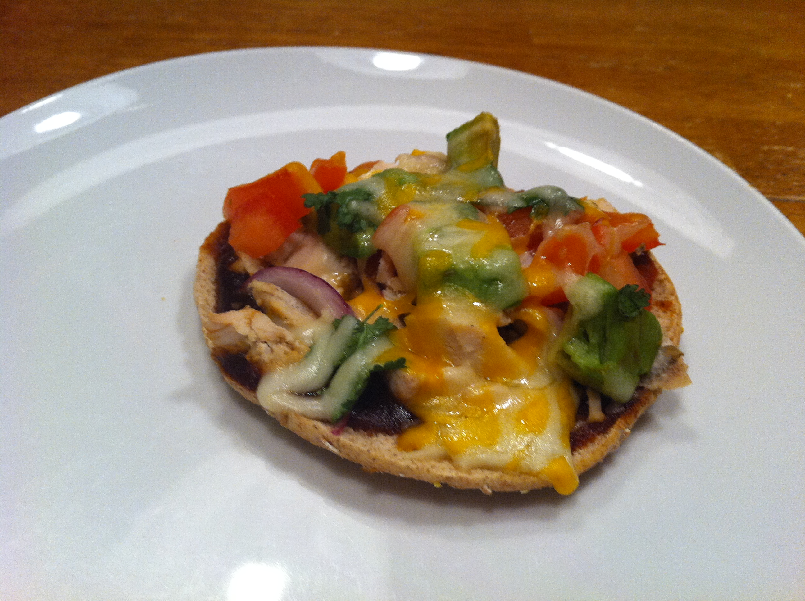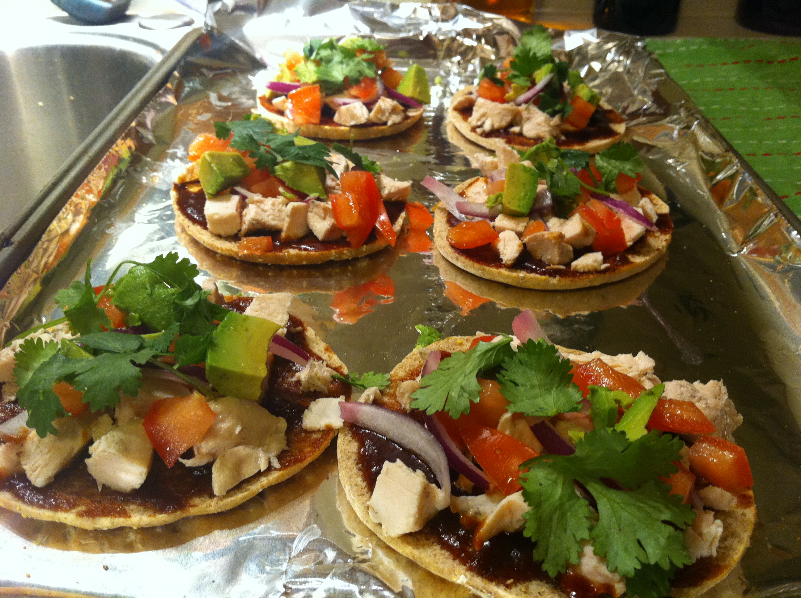 - Add chicken, onion, tomatoes, avocado, cilantro.