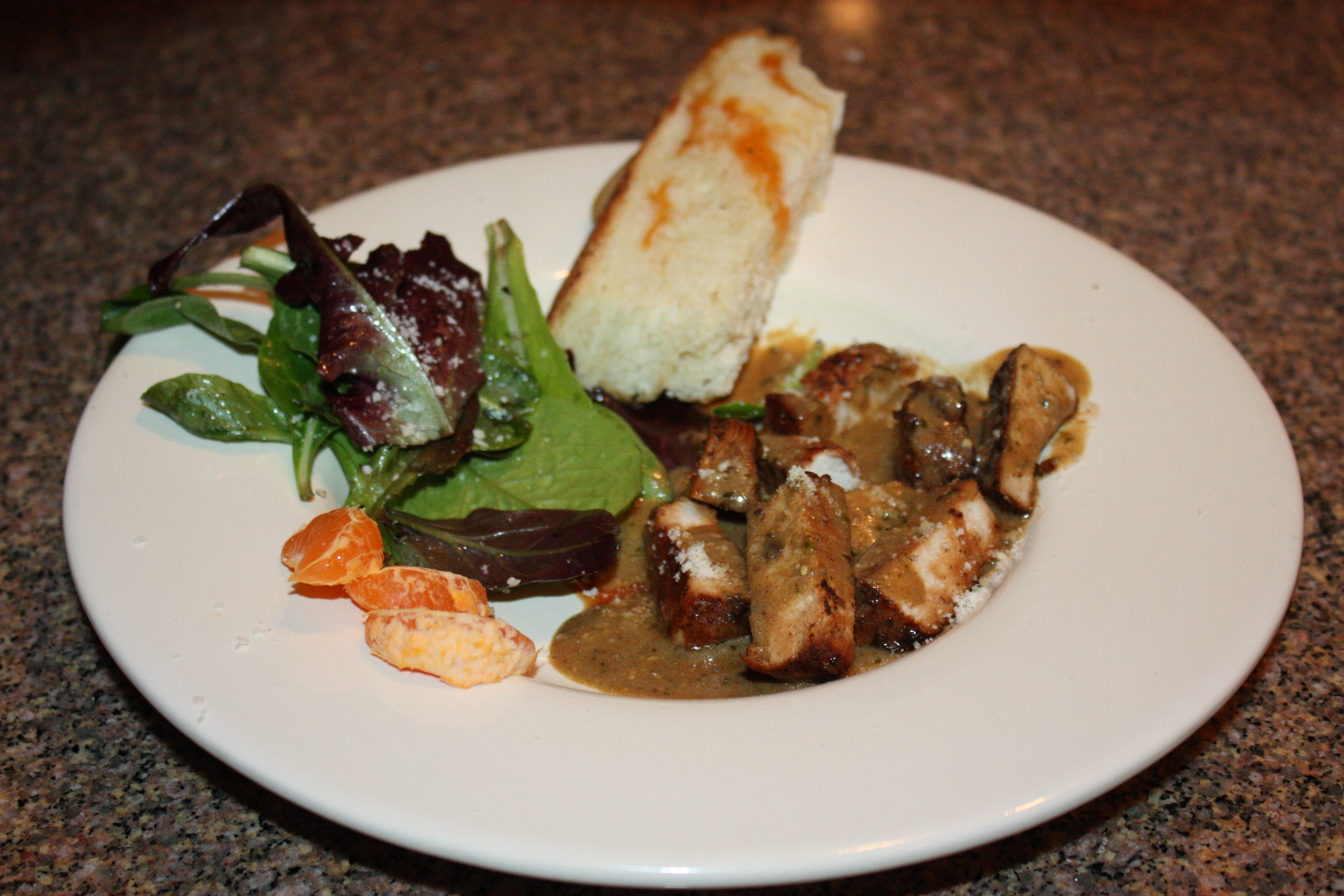 - Plate your food. Chicken first and then top with gravy. Throw a handful of salad on the side. Sprinkle the cheese over the chicken and greens. I served our dinner with mandarin oranges and cheddar-garlic bread from Great Harvest Bread Co.