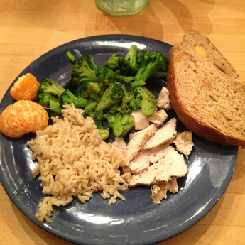 This meal doesn’t need the bread since you already have brown rice as a carb. I was trying to use this bread up by serving it but I didn’t even eat it. The clementine orange added some nice color to the plate and filled a fruit serving.