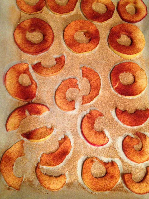I got a recipe from my daughter’s school for apple chips. They were so simple, I decided to try them. Oh my goodness were they easy and delicious! They take a long time to cook because you’re essentially dehydrating the apples. However, the hands-on time is minimal.