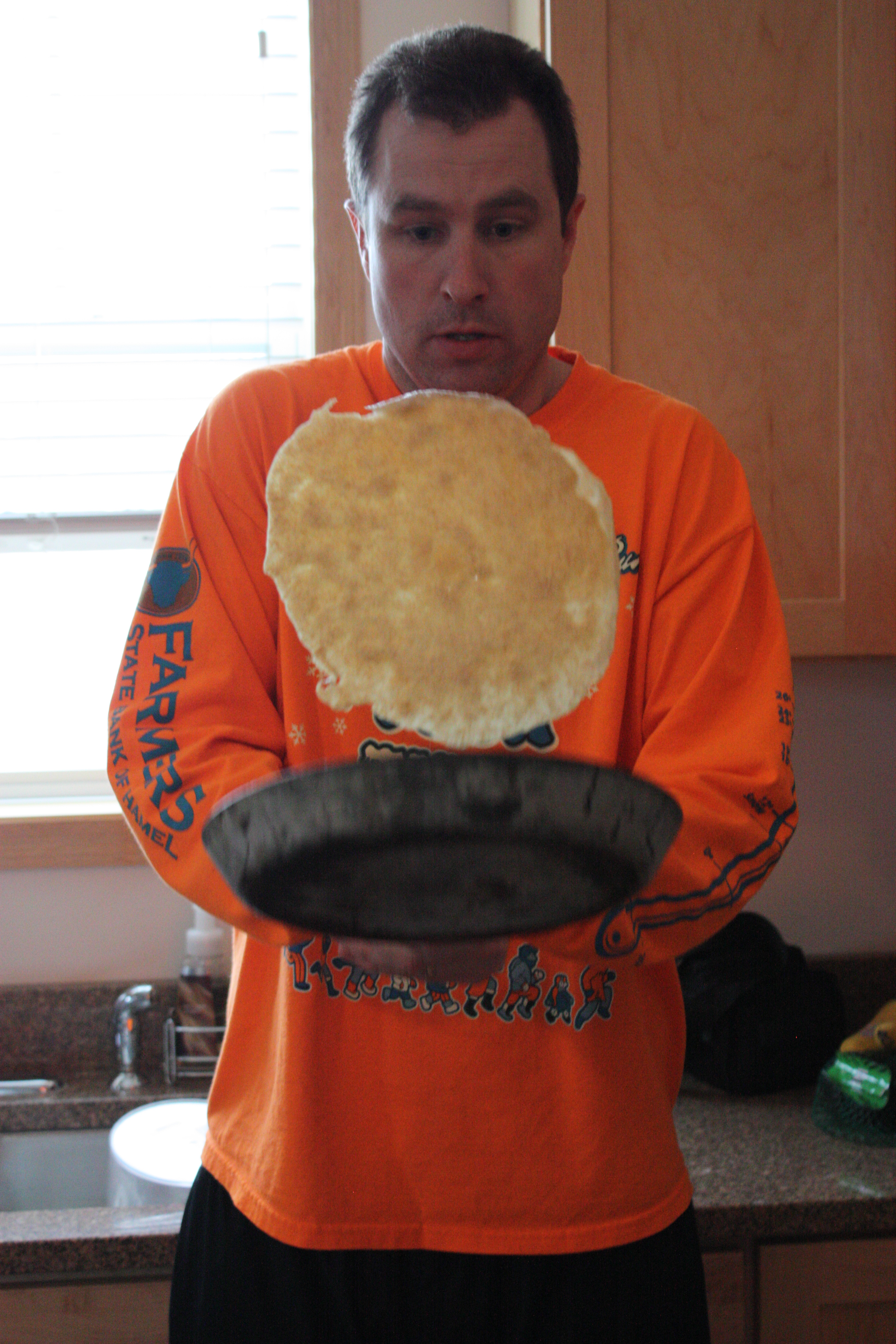 - Once the underside is lightly brown (as in the picture above), it’s time to flip the pancake. It’s completely OK to lift the edge and take a peek. You may also be able to tell because the edges may start to curl up. Since the pancakes are so thin, you shouldn’t have to worry about batter splattering everywhere when you flip them. I use a spatula to flip them. My husband does this: